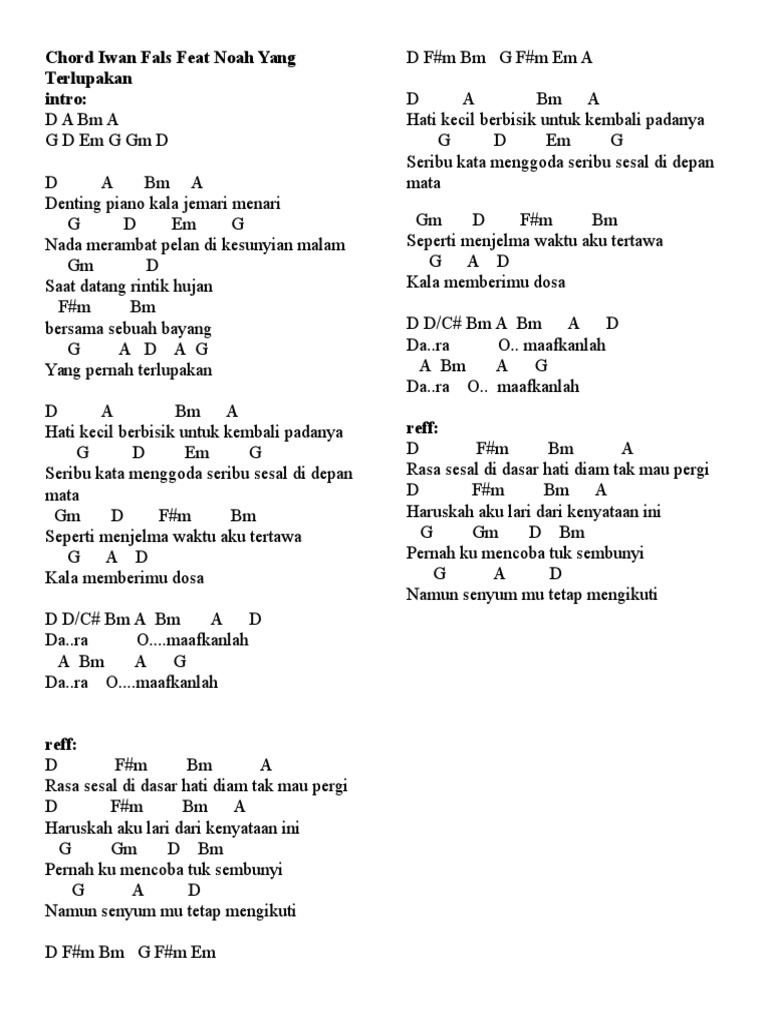 Untuk chord kedua udud d (du). Lagu ini dirilis pada tahun 1981 silam dan masuk ke dalam albumnya yang bertajuk 'sarjana. Our goal is to help musicians like you to learn to play the music they love. Am g kala jemari menari. Chord iwan fals yang terlupakan menggunakan kunci gitar dasar untuk pemula dan versi lagu dari iwan fals yang berjudul yang terlupakan ini juga populer dengan sebutan denting piano.